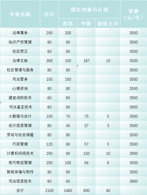 作为全省唯一的司法警官类高职院校,学院始终围绕“警”字特色,秉承“明德尚法,弘毅致远”的校训,坚持“立足司法行政、面向政法系统、服务社会需求”的办学定位和学历教育与干部培训“两翼齐飞”的发展战略,坚持 “政治建校”首要办学原则,落实立德树人根本任务。以服务发展为宗旨、以促进就业为导向、以教学工作为中心、以能力培养为核心,主动切合行业和社会需求,不断推进办学模式和办学机制的转变,为国家和社会培养了大批高素质技术技能型专门人才。自2019年起,5个专业被纳入入警便捷机制,实行高考提前批次招生,为监狱戒毒行业定向培养,毕业时参加主管部门组织的公务员定向招录考试,择优录用为监狱戒毒人民警察。