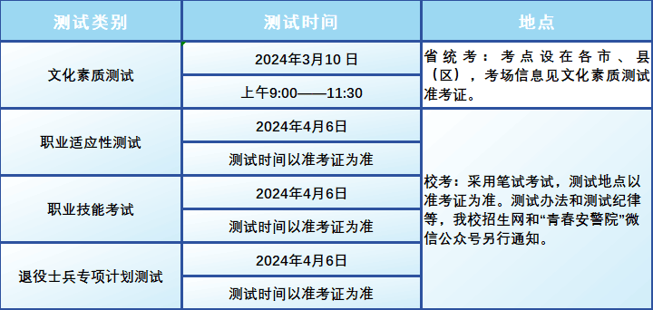 2024年分类考试招生专业和计划及考试时间和方式等以安徽省教育招生考试院公布的招生章程为准。请考生密切关注“青春安警院”微信公众号。